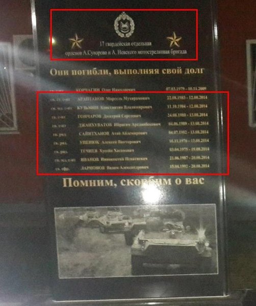 Украинское издание Informnapalm в сентябре утверждало, что среди формирований российских вооруженных сил, участвовавших в боях на востоке Украины, значилась 17-я мотострелковая бригада из Чечни. При этом издание опубликовало имена четырех погибших солдат, приписанных к этой бригаде: это Вадим Ларионов, Марсель Араптанов, Константин Кузьмин и Иннокентий Иванов - эти же имена присутствуют на стеле в городе Шали.