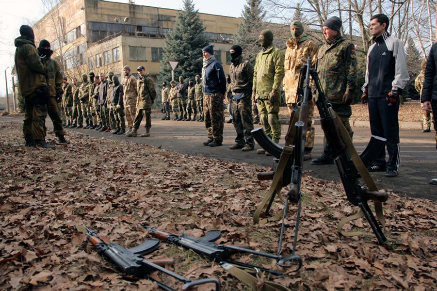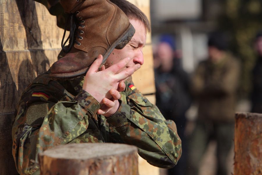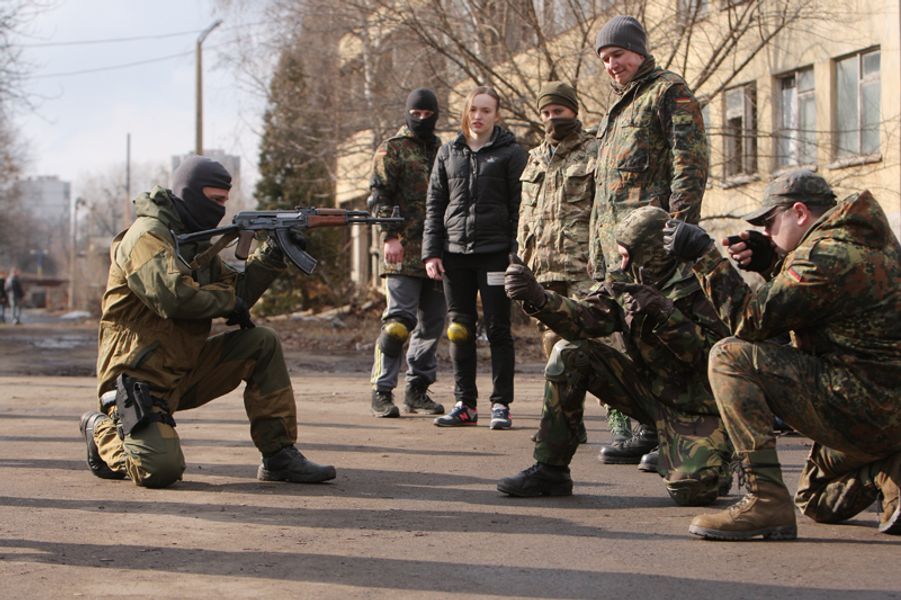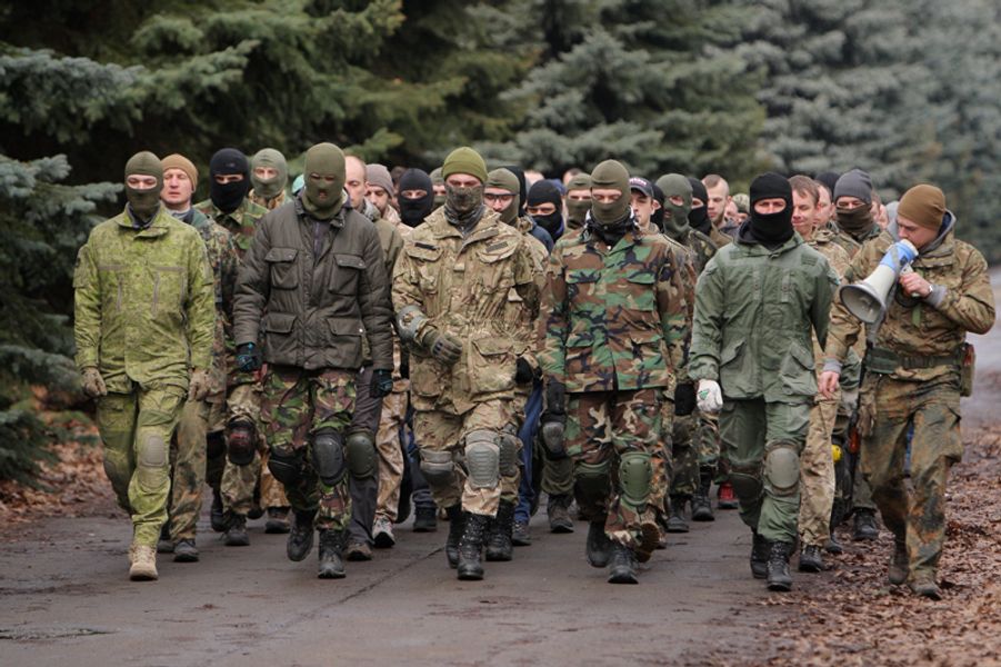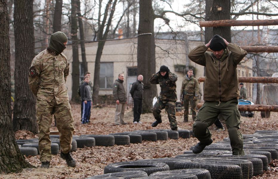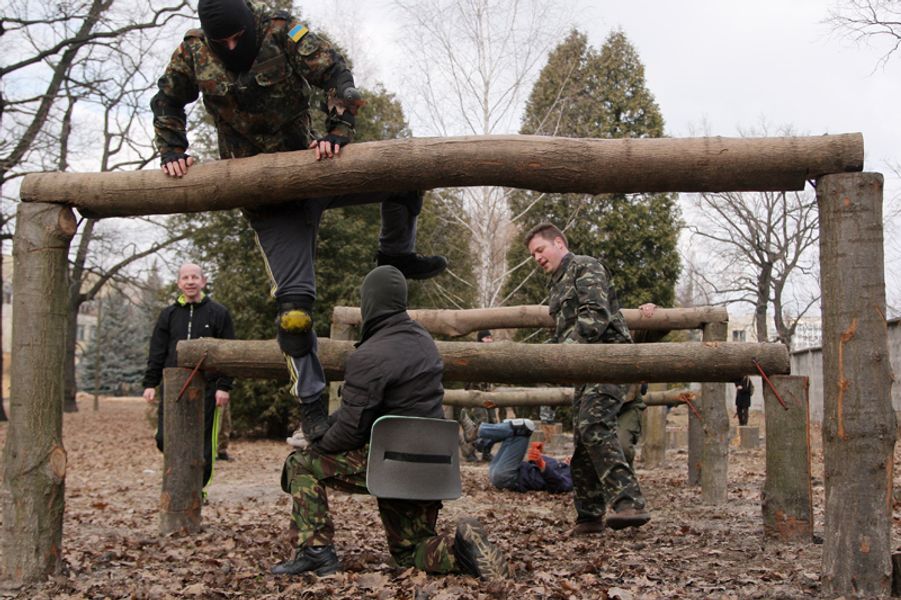 Полк особого назначения "Азов" провел тренировку для гражданского населения. Киевлян, которые никогда не держали оружия в руках и не служили в армии, обучали строевой подготовке, основам тактики, обращению со стрелковым оружием. Также сознательные граждане могли попробовать свои силы на полосе препятствий