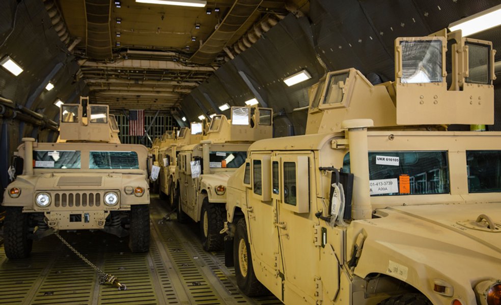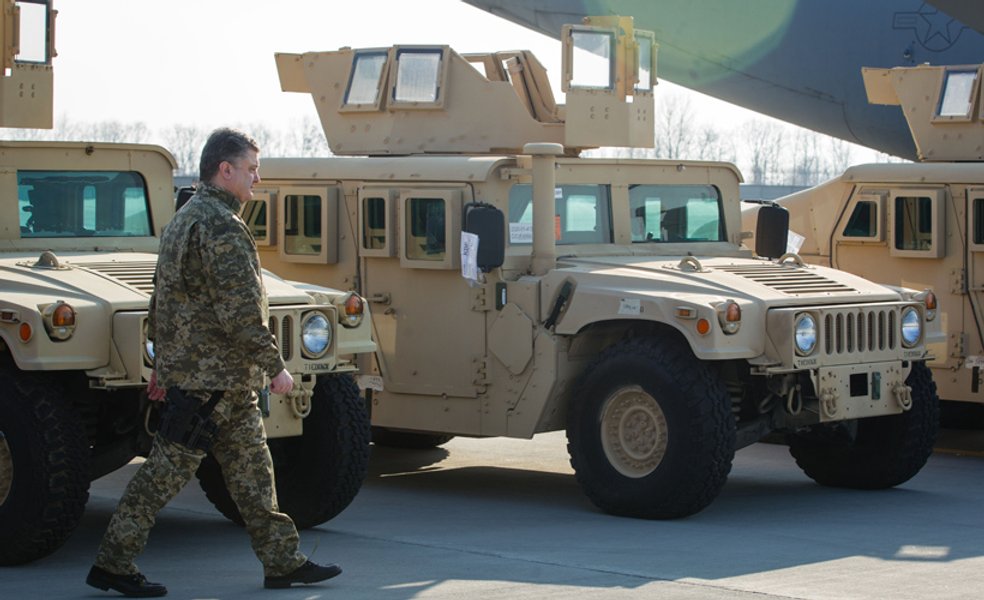 Президент Украины Петр Порошенко встретил партию из 10 американских военных автомобилей HMMWV в международном аэропорту "Борисполь". Глава государства осмотрел бронированные автомобили, после чего испытал один из них, лично управляя транспортным средством
