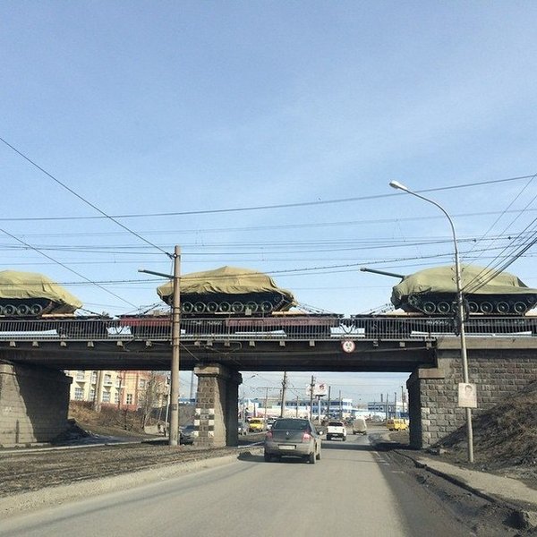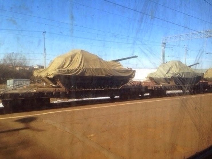 Власти РФ обещали продемонстрировать танк на параде 9 мая. Большинство фотографий "Арматы" на железнодорожных транспортировочных платформах для тяжелой техники. На всех снимках башня Т-14 накрыта брезентом.