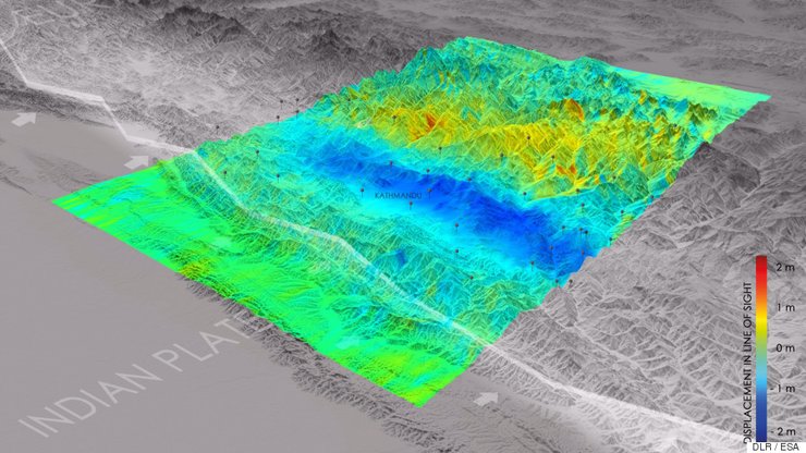 По данным Аэрокосмического центра Германии, часть земной поверхности в районе Катманду размером примерно 88,5 на 29 км (более 2,5 тыс. кв. км) поднялась на 91 сантиметр.