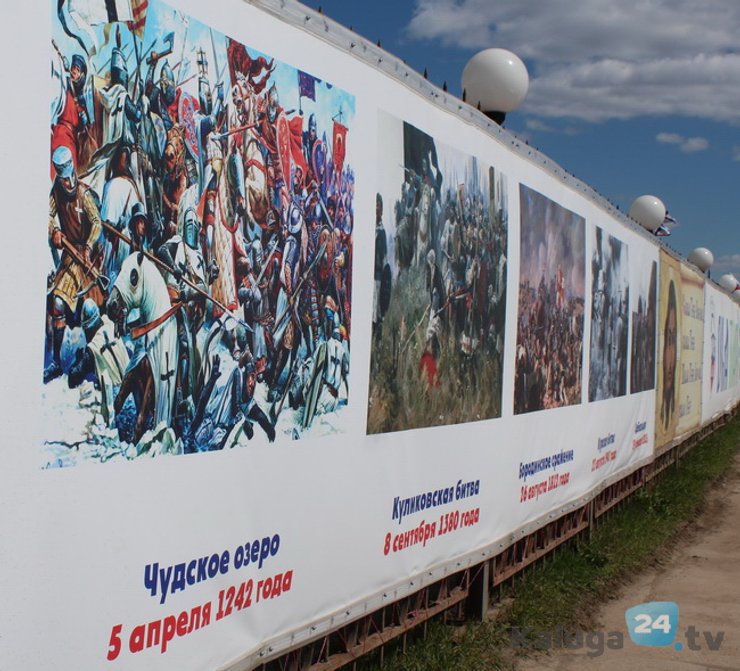 На баннере указаны битва на Чудском озере, Куликовская битва, Бородинское сражение и Дебальцево, покинутый украинскими военнослужащими в феврале.