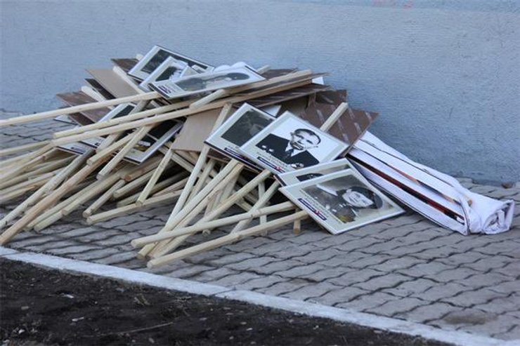 Российский журналист Андрей Мальгин выложил снимаки выброшенных транспаранты с фото, представленные на параде ко Дню Победы, как портреты "павших в Великой Отечественной войне".