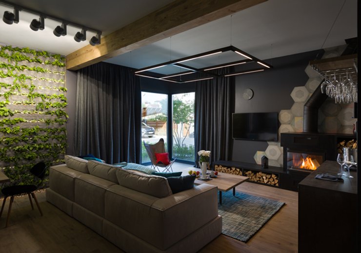 Трехэтажные дома рассчитаны на семьи с детьми. Уютный интерьер с элементами стиля loft соответствует современным тенденциям дизайна. Зеленая стена в гостиной, картины на стенах, мебель-трансформер и много места для хранения вещей – в обстановке практичность и эстетика идут "рука об руку". Дом оснащен центральным пылесосом Decovac для легкой и гипоаллергенной уборки на каждом этаже.