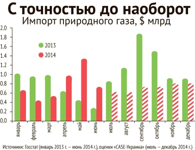 Первое. Импорт газа будет падать. Ситуация с ним в 2014 году с точностью до наоборот повторяет ситуацию 2013-го. В прошлом году правительство Азарова до последнего тянуло с покупкой газа, поскольку торговый дефицит рос с завидной скоростью, а правительству нужно было удерживать стабильность валюты и готовиться к решающим выборам. Поэтому все закупки перенесли на второе полугодие, что среди многих прочих факторов стало причиной хаотичного выпрашивания Януковичем денег то у ЕС, то у России осенью 2013-го. В нынешнем году, в частности во втором полугодии, наш счет за импортный газ будет значительно меньше, даже если Россия возобновит поставки. Причин две: а) много закачали до июня; б) цена газа с учетом судебного разбирательства в Стокгольме будет меньше прошлогодних $400 за тысячу кубометров (ориентировочно $350). В сухом остатке наш энергетический импорт будет минимум на $2 млрд меньше, чем в прошлом году.