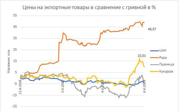 Погодные условия, а именно, катастрофическое увеличение количества осадков в конце мая и начале июня в США, привели к тому, что американские фермеры могут столкнулись с худшими климатическими условиями для посева кукурузы в современной истории. Миллионы акров сельскохозяйственных угодий США в этом году останутся неиспользованными из-за наводнений. И многие фермеры, которым удалось посадить урожай, сообщают о крайне разочаровывающих результатах. Департамент сельского хозяйства США (USDA) сообщает что только 67% кукурузы засеяно по состоянию на 2 июня, тогда как этому сроку уже должно было быть засеяно более 96%. Все это привело к росту цен до 3-х летнего максимума до уровня в $412 за бушель. В то же время, Департамент сельского хозяйства США (USDA) сообщает о том, что урожай кукурузы в Украине в 2019-2020 МГ может составить 33 миллиона тонн. Это на 7,8% ниже, чем в 2018-2019 МГ, однако экспорт зерновых вырос с 1,6 млрд. долл. до 2,44 млрд. долл. в 1 квартале 2019 по отношению к аналогичному периоду прошлого года.