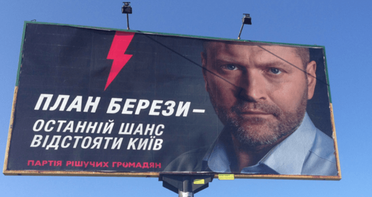 Любопытная рекламная тактика и стратегия у Борислава Березы. Он предстает на бело-зеленых бигбордах с суровым лицом и надписью: "За безопасный Киев". В уголке указано: "Эко Партия Березы". Береза ратует за экологическую безопасность? Но вспомним, что 5 лет назад, на прошлых выборах он представал на черных бигбордах, где была красная молния и угрожающая надпись: "Последний шанс отстоять Киев".