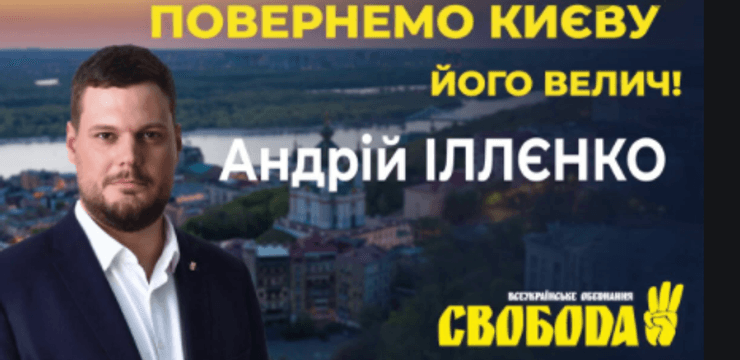 "Свободовец" Андрей Ильенко предстает на постерах на фоне красивой панорамы Киева: с церквями и днепровскими склонами. Надпись: "Вернем Киеву его величие". Вспомним, что усилиями, в первую очередь, членов ВО "Свобода" в пока еще действующем Киевсовете было переименовано 180 улиц столицы. Московский проспект на Степана Бандеры, Ватутина – на Шухевича, Жукова – на улицу Украинской Кубани.