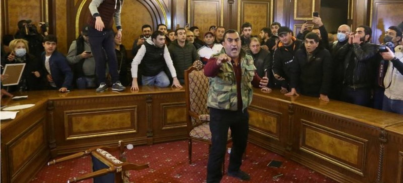 На снимке: протестующие против мирного соглашения по Карабаху армяне ворвались в зал заседаний парламента страны.