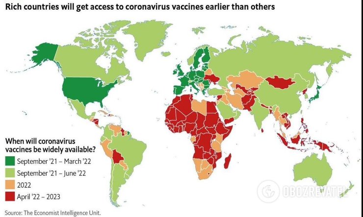 Таким образом, Украина оказалась в самом хвосте мировой очереди на вакцину. Мы стали единственной европейской страной, которой не светит массовый доступ к вакцине не то, что в марте 2021 года, как обещает министр Степанов, но и в 2021 году в принципе.Это и есть внутренняя география, которая намного более точно позиционирует место страны, чем позиция на глобусе.