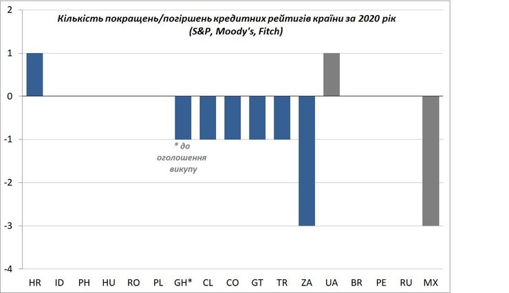 Однако, похоже, что проблем у стран, прибегали к выкупу, таки было немного больше. По крайней мере, негативных пересмотров суверенных кредитных рейтингов по таким странам было больше (второй график).