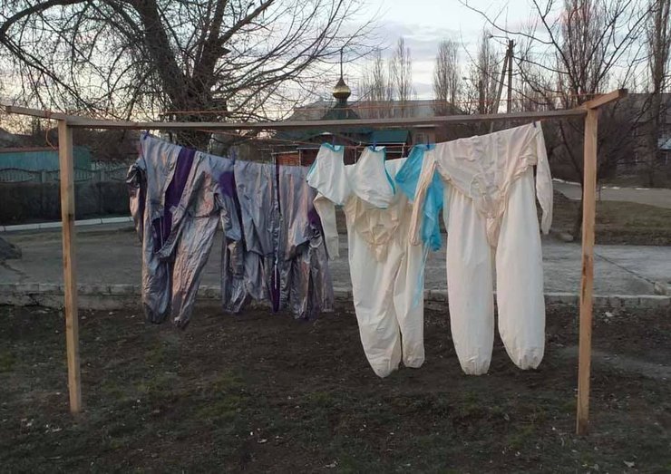 На первом фото — хоздворик одной из городских больниц на востоке Украины, на котором сушатся постиранные защитные комбинезоны для медиков. Получил от знакомого, у которого там от "короны" спасали близкого человека. И он просил не называть город, чтобы никого из врачей вдруг не подставить.