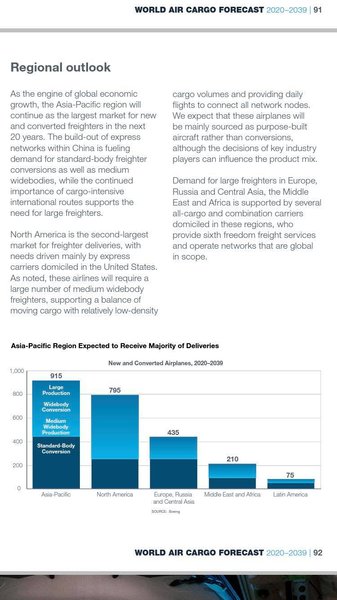 Так вот. По их прогнозам, с 2020- по 2039 годы рынок транспортных самолетов увеличится в полтора раза. С учетом замены существующего флота и создания нового, ориентировочный спрос составит 2500 самолетов. Самый крупный прирост спроса ожидается на рынке Азии. Именно здесь будет идти основная борьба. И самое интересное, что эти рынки сейчас никому не принадлежат.