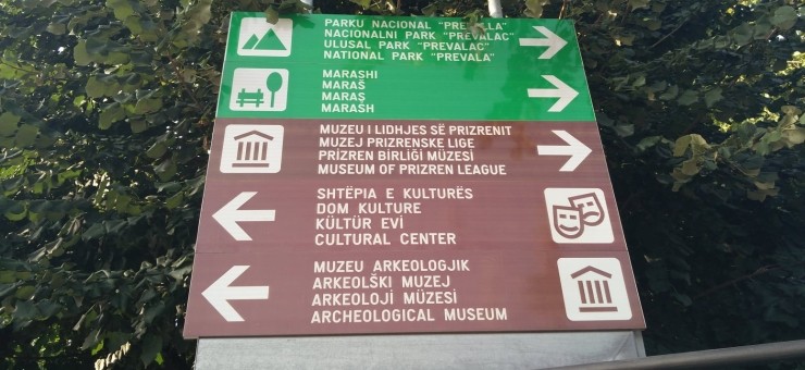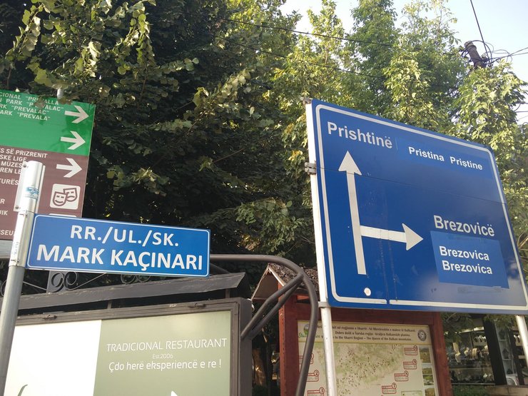 Соответственно, обозначения улиц/площадей/направлений на трех языках (албанском, сербском и турецком), а туристическая информация — на четырех (те же три, плюс "универсальный" английский).