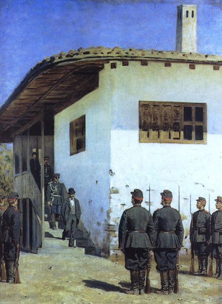 Вот эта картина перед вами. Сюжет вроде совсем не замысловатый: болгарское село времен Балканской войны 1878-79 годов. Конвой русских солдат с винтовками готов "принять" мужчину в европейском костюме со шляпой-"котелком" на голове. Сзади него по лестнице спускается военный аудитор (следователь) с папкой-"делом" в руке.