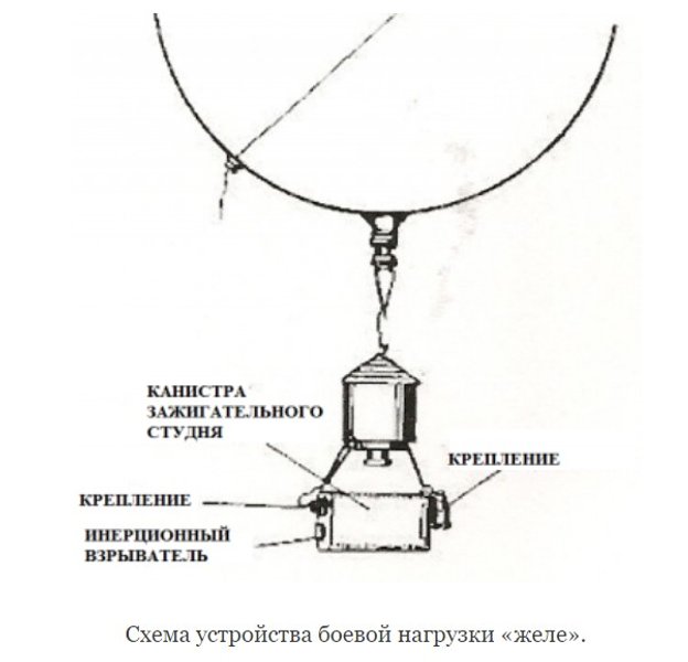 "Пиво", "желе" и "носки" были зажигательными боеприпасами. "Пиво" представляло собой жестяной контейнер, в который укладывалось 7-8 бутылок-гранат, начиненных белым фосфором и специальным химическим воспламенителем. "Желе" представляло собой банку, наполненную зажигательной смесью — напалмом в виде студня. Каждая банка содержала 4,5 литра смеси и была оснащена инерционным воспламенителем, который срабатывал во время столкновения с землей или иным препятствием. "Носок" — действительно был похож на холщовый носок, наполненный зажигательным материалом весом около 2,7 кг. Каждый воздушный шар мог нести три "носка".