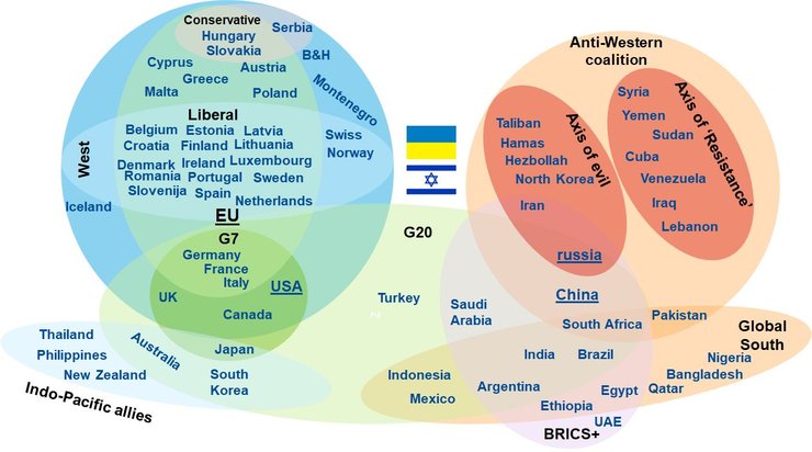 - и большая формальная антизападная коалиция, которую можно разделить на 2 части: ось зла (Россия, Иран, Северная Корея, Талибан, ХАМАС, Хезбола) и ось "сопротивления", которую создали в том числе против Израиля (Сирия, Йемен, Судан, Ирак, Ливан и т.д.).