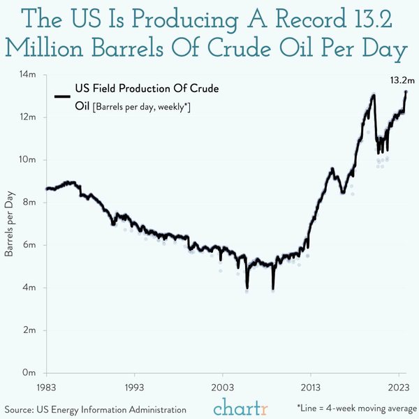 США вышли на рекордное количество добычи сырой нефти: 13.2 млн баррелей в день.