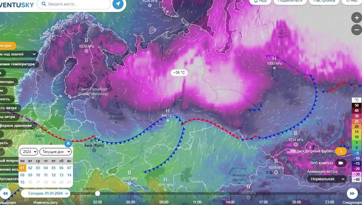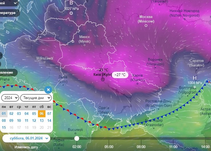 Проникновение стужи на европейскую территорию произошло еще в конце 2023 года. Уже к 30 декабря температура, например, на Вятке (Киров) устойчиво опустилась ниже -20°C. К Новому году арктический антициклон захватил обширную территорию с передовой стужи по дуге Хельсинки — Новгород — Владимир — Казань — Тольятти. Область высокого давления будет постепенно смещаться в сторону Украины, перемещая студеные воздушные массы. И если до полудня 2 января в северной Украине около нуля и выше, то уже 4-го числа можно ожидать сразу до -18°C.