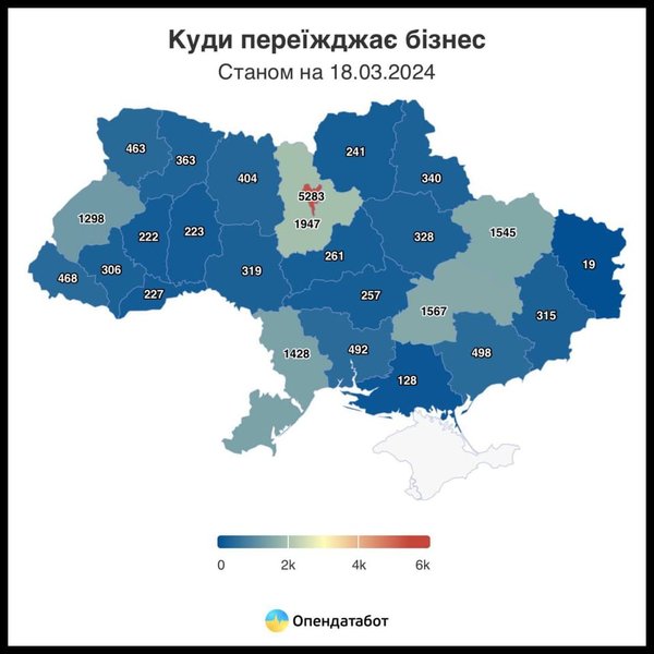 Как показала карта релокаций, Киевская, Днепропетровская, Одесская и Харьковская области лидируют по числу релокаций наряду с Закарпатьем и значительно опережают области на западе.