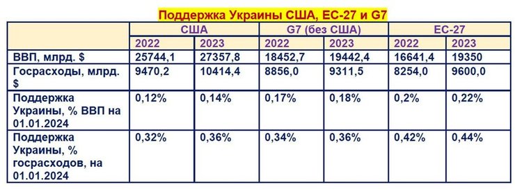Такой объем финансовой, ресурсной поддержки Украины со стороны США, ЕС-27 и G7 — мизер. Он точно никак не влияет на бюджетную устойчивость этих стран, тем более на инфляцию или состояние платежных балансов. В этом году, дай Бог, чтобы из ~$61 млрд утвержденных Палатой представителей денег в Украину реально пришло $8 млрд. Такие деньги, как говорят, только для поддержки штанов в окопах, но никак не для победы.