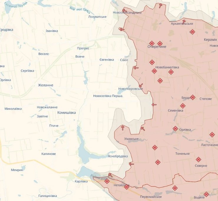 В этом отношении, "крайняя необходимость" для него в продвижении к рубежу Сокол — Новопокровское, очевидно, постепенно отпадает, хотя, безусловно, остается достаточно желательной. Ведь его передовые подразделения постепенно продвигаются к с. Новоселовка Первая с другого направления — с юга, что по большому счету, является еще более "глубоким" в обеспечении южного фланга "очеретинской" группы, чем вышеуказанный рубеж.