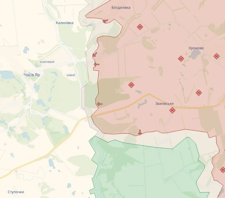 Очевидно, командование противника на данном этапе, в целом по направлению на Часов Яр — Константиновка ставит перед собой ближайшую задачу — полное вытеснение передовых подразделений ВСУ западнее канала "Северский Донец — Донбасс" в пределах всего города Часов Яр. По сути, противник проводит по этому направлению "лобовое вытеснение" наших войск ЗА КАНАЛ.
