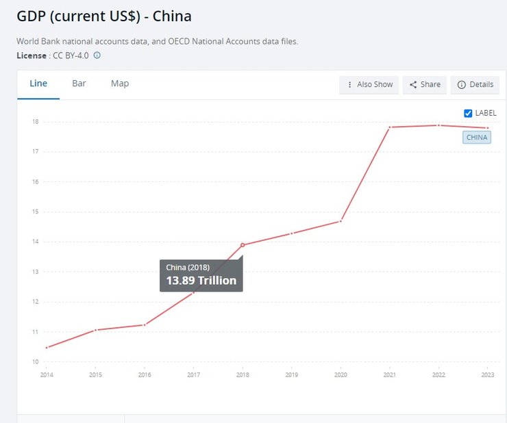 Китай — это действительно уважаемый экономический игрок, с которым нужно считаться, но есть много "но". ВВП КНР, посчитанный по покупательной способности, составил 31,2 трлн долларов, а номинальный ВВП — только 17,8 трлн. При этом, в 2021-2023 гг. номинальный ВВП КНР в долларах почти не менялся, прекратив рост (см. график).