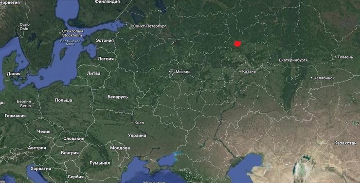 Как, например, легкое "задымление" на еще одном (третьем!) объекте "Росрезерва" — комбинате "Зенит" в г. Котельнич (Кировская область). Ибо он далеко. Для наглядности — обозначен красной точкой. Если мерять от Киева, то до Котельнича — как до Мюнхена.
