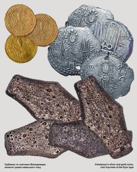 В Киевской Руси с XI века в обращении были киевские гривны шестиугольной формы, весом около 140-160 г (другие источники указывают, что вес был около 204 г), служившие единицей платежа и средством накопления до монголо-татарского нашествия. Также на Руси чеканили монеты, в обращении были златники и сребреники. Кстати, их по сей день можно найти в продаже у нумизматов, по крайней мере серебряники времен Ярослава Мудрого. Также существует предположение одного из происхождений названия российской валюты рубль. Во времена Киевской Руси при недостатке мелкой монеты торговцы рубили серебряную гривну на куски, и эти кусочки гривны называли рублем. Не берусь утверждать об аутентичности этой истории, в научных кругах она существовала в форме басни, но она логична, да и учитывая переписывание истории Украины КГБ и ЦК КПСС, сделать из нее басню могли именно из идеологических соображений. Как ни крути, такая трактовка происхождения рубля как кусочков гривны является унизительной для российской валюты.