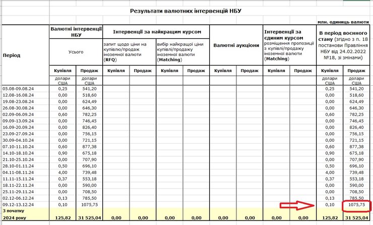 Так вот: на прошлой неделе (с 9 по 13 декабря) Нацбанк продал $1,076 млрд. Это второй пик таких продаж за весь 2024 год. Первый был в мае (с 27 по 31 мая) на уровне $1,091 млрд после волны девальвации гривны, когда официальный курс прыгнул с 39,3 грн/$ до 40,5 грн/$, а наличные ценники танцевали и выше. Что имеем и теперь.