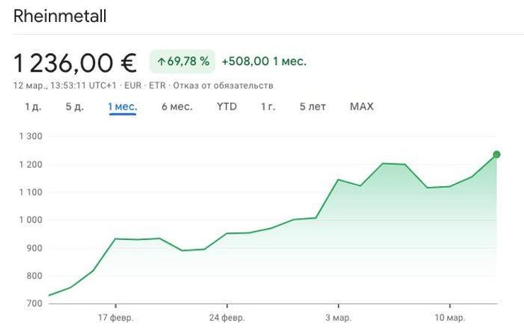 А тем временем европейский Rheinmetall растет как на дрожжах: немецкий военный гигант взлетел почти на +70% только за последний месяц… и это в то время, когда валится американский рынок.