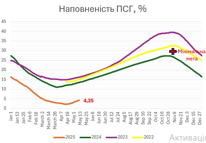 На 1 мая в ПХГ было всего 0.962 млрд м3, а на 11 мая — 1.277 млрд м3. То есть сейчас ежедневная закачка составляет 28.5 млн м3. С такими темпами до 1 ноября будет закачано в ПХГ лишь 6.15 млрд м3 из минимально необходимых 9 млрд м3, или лишь 68%.