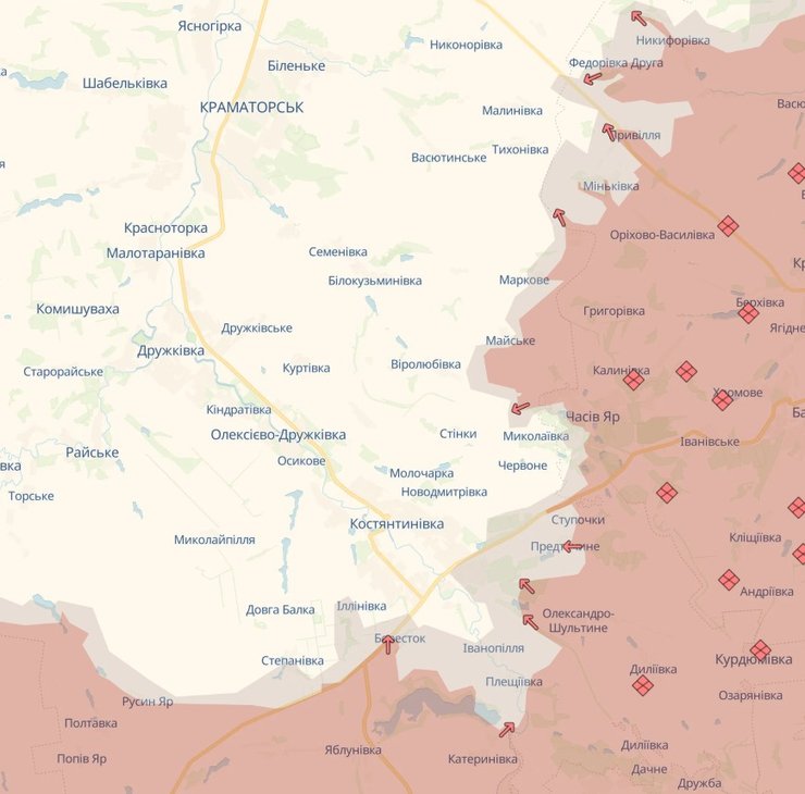 Военный аналитик Константин Машовец видит контуры дальнейшей операции РФ на Константиновском направлении. Ему кажется, что вместо лобового штурма Константиновки, кровавого и неблагодарного, враг попытается обойти город с флангов, пытаясь замкнуть кольцо где-то в районе Дружковки...
