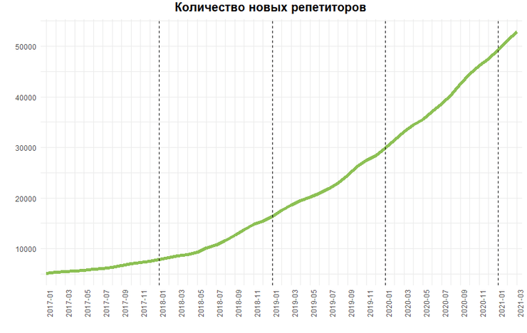 Репетиторство – это возможность заработка денег для специалистов многих отраслей, а не только для учителей. Самое важное квалификационное требование – это профильные знания. На приведенной ниже диаграмме четко заметна динамика увеличения количества репетиторов. Средний ежемесячный прирост частных преподавателей составляет 1629 человек. Стоит отметить, что такое предложение полностью соответствует рыночному спросу: количество новых клиентов, которые искали репетиторов в этот период было вдвое больше и составляло 51 118 в год или 4 260 человек в месяц.
