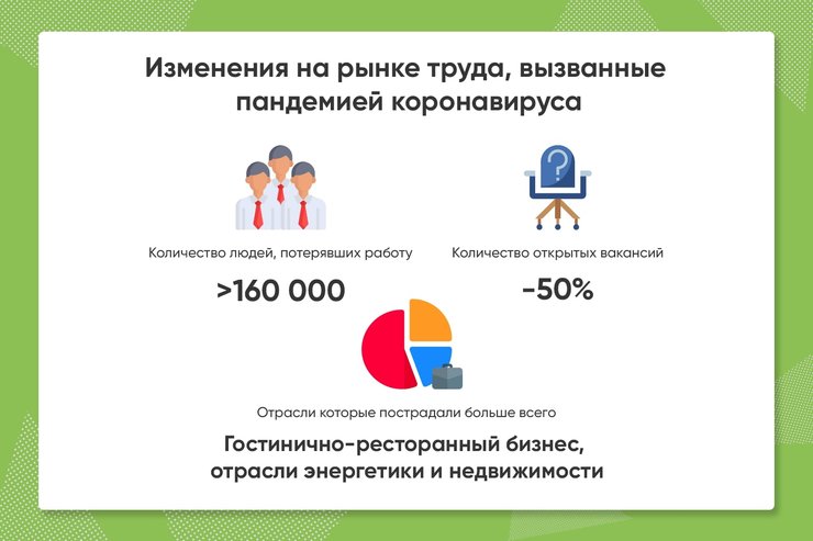 - Максимальная динамика роста безработицы наблюдается в тех отраслях, которые практически полностью прекратили или частично ограничили свою деятельность вследствие карантина или полного локдауна, а именно: гостинично-ресторанный бизнес, сфера поставок электроэнергии и сфера недвижимости;