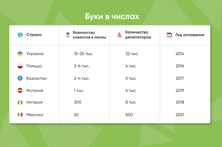 Компания работает с 2014 года. Менее чем за 7 лет Буки достигла больших успехов в области EdTech и стала международной компанией, которая имеет собственную базу учеников и преподавателей в 6 странах мира, а именно: Украине, Польше, Казахстане, Испании, Нигерии и Мексике. Общее количество клиентов составляет приблизительно 137 738 в год, а количество зарегистрированных преподавателей превышает 73 000.