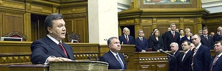 В присутствии депутатов, иностранных гостей, высокопоставленных лиц Украины и одного из трех своих предшественников-президентов (Леонида Кучмы), Янукович положил правую руку на Евангелие и специальное издание Конституции, после чего произнес слова присяги.