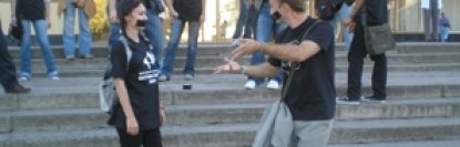 Как выяснил корреспондент Фокуса, эти молодые люди - члены эпатажной литературной группы "Стан". Они призвали также не пачкать руки о грязные бюллетени.