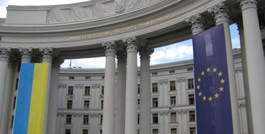 Министерство иностранных дел добилось права временно оставить на колоннах здания баннер, содержащий в себе цвета Государственного Флага Украины