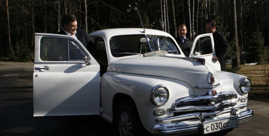 Янукович принял предложение Медведева совершить небольшую экскурсию по территории резиденции на раритетном автомобиле "Победа", принадлежащем президенту России, который сам сел за руль.