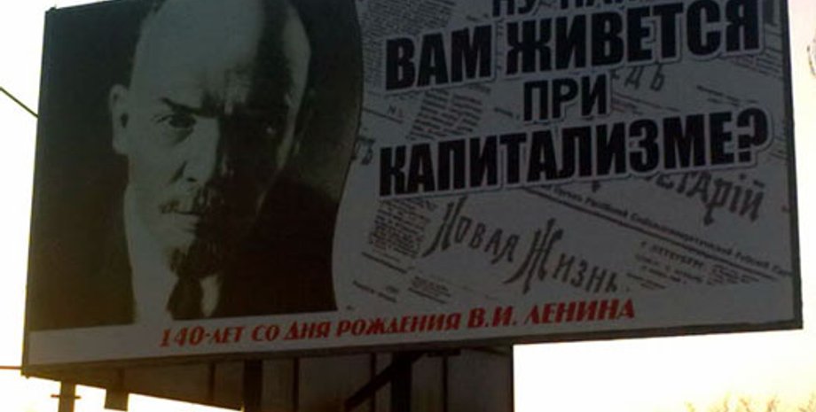 Всего в Луганске было установлено около сорока рекламных щитов, на которых изображен Ленин, а рядом - надпись: "Ну как вам живется при капитализме?". Креатив этой рекламы объяснил секретарь луганского обкома КПУ Максим Чаленко: "Она напоминает о том, что родился Владимир Ильич. А с другой стороны в сжатой форме показаны его идеи. Показывает, что у людей есть выбор: капитализм, или социализм".