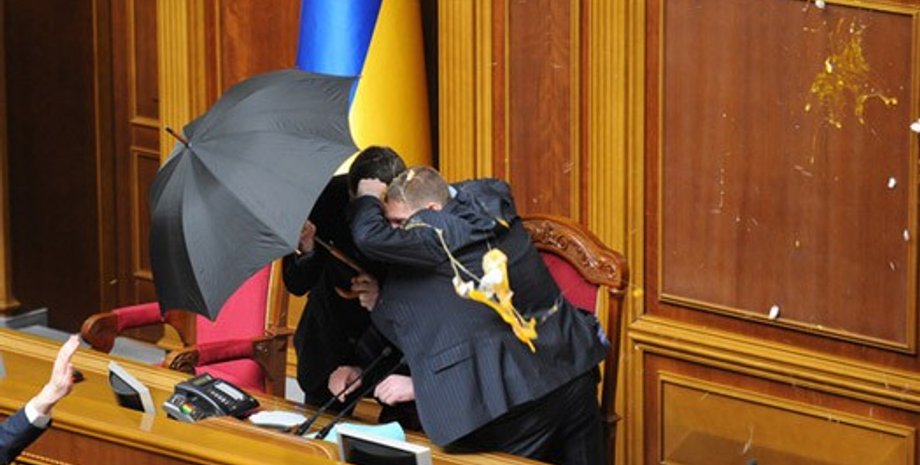 Так описывает вчерашние события в украинском парламенте британская The Guardian, напоминая, что при голосовании в Раде были задействованы яйца, кулаки, дымовые шашки и зонтик в качестве щита.