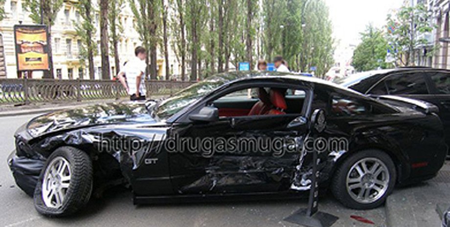 Ford Mustang GT и Mercedes E-class двигались по бульвару Шевченко в направлении Бессарабской площади. Водитель Mercedes решил повернуть на ул. Пушкинскую и зацепил левой передней частью Ford Mustang, которого от удара закрутило. Автомобиль пролетел в сторону Бессарабки около 30 метров и врезался в три припаркованных автомобиля на VIP-парковке отеля Премьер-палац. В результате были повреждены Honda Accord Coupe (которая приняла на себя основной удар), BMW Z4 и Toyota Camry, передает Друга смуга.