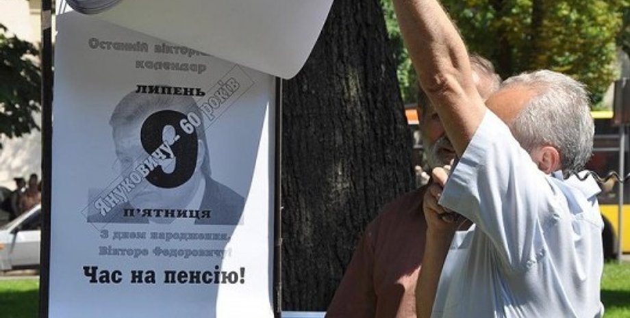 "Мы торжественно открываем отрывной перекидной календарь для Януковича. Мы подчеркиваем, что сегодня у нас на календаре 9 июня, ровно через 30 дней Виктору Федоровичу исполнится 60 лет. Согласно закону О пенсионном обеспечении возраст выхода на пенсию для мужчин составляет 60 лет, согласно закону о государственной службе возраст выхода на пенсию для мужчин-госслужащих составляет 60 лет. Мы подчеркиваем, что Президент Украины, как государственный служащий высокого ранга также подпадает под эти законы", - цитирует zaxid.net заместителя председателя УРП, депутата Львовского облсовета Ростислава Новоженца.