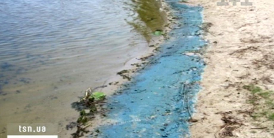 Пляжи в заводи Днепра возле Кончи-Заспы загрязнены неизвестным химическим веществом. Берег на расстоянии ста метров покрыт маслянистым веществом бирюзового цвета с едким запахом