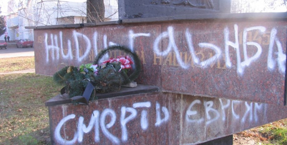 На памятнике были написаны лозунги "Жидам позор", "Смерть евреям"и др. Также была нарисована большая свастика, сообщает kirovograd.net.