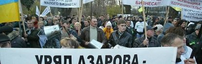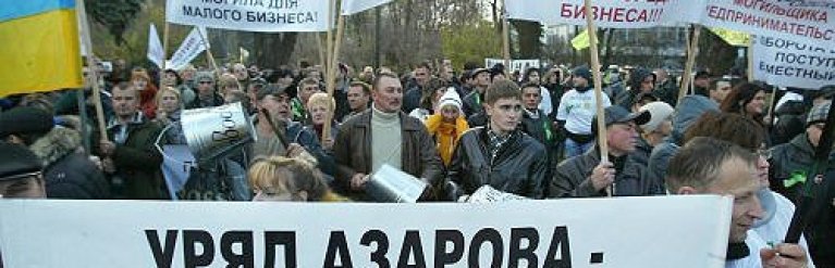 Кроме флагов и плакатов с названиями населенных пунктов Украины, они держат плакаты с надписями: "Остановим налоговый террор", "Оплата социального взноса – по доходам", "Азаров, Хомутынник, Тигипко, Бродский – на базар со своим Налоговым кодексом!" и другие.