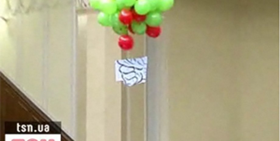 Сегодня во время рассмотрения Налогового кодекса депутаты от БЮТ Одарченко, Волынец и Сас принесли в Верховную Раду воздушные шарики и прикрепленное к ним изображение дули. Шарики поднялись вверх и зависли под куполом сессионного зала.