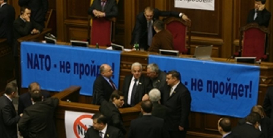 Депутаты от фракции Партии регионов вывесили на трибуне Верховной Рады плакат "НАТО не пройдет!", Кроме того, на президиуме Верховной Рады вывешен аналогичный плакат. Также депутаты от фракции Партии регионов заблокировали вход в кулуарах, через который обычно в зал входит председатель Верховной Рады.